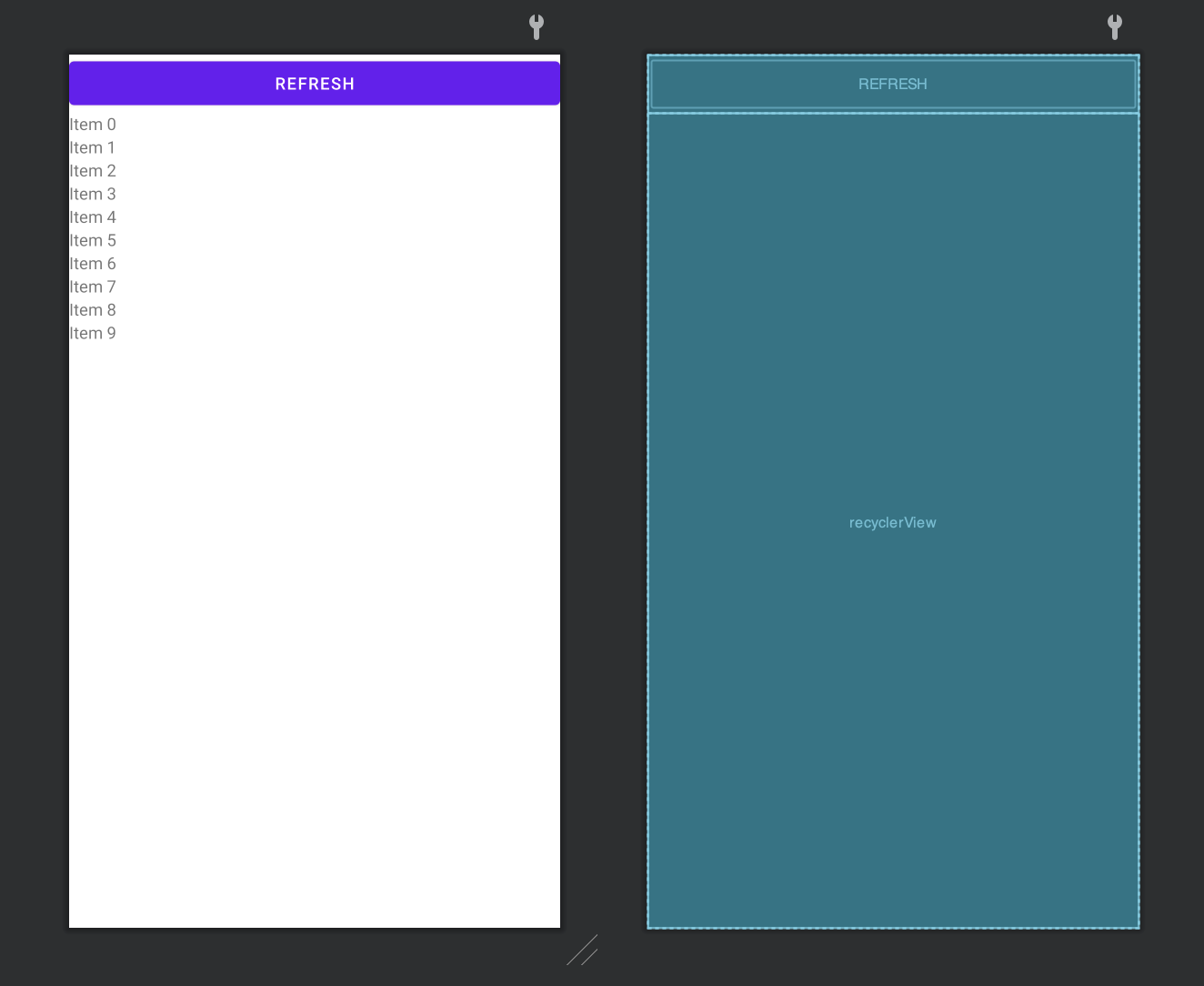 `btn_refresh`에는 `generateStringList(int size)`를 사용해서 새로운 리스트를 얻어오고, 어댑터의 `submitList(List<T> newList)`메소드를 사용해서 새로운 리스트를 넣어주는 기능을 구현해줬다.