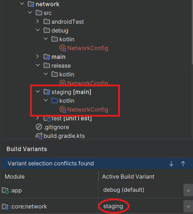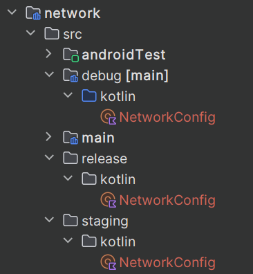 일단 `network` 모듈의 `src` 폴더 안에 내가 설정한 BuildType의 이름으로 폴더들을 만들어줬다.